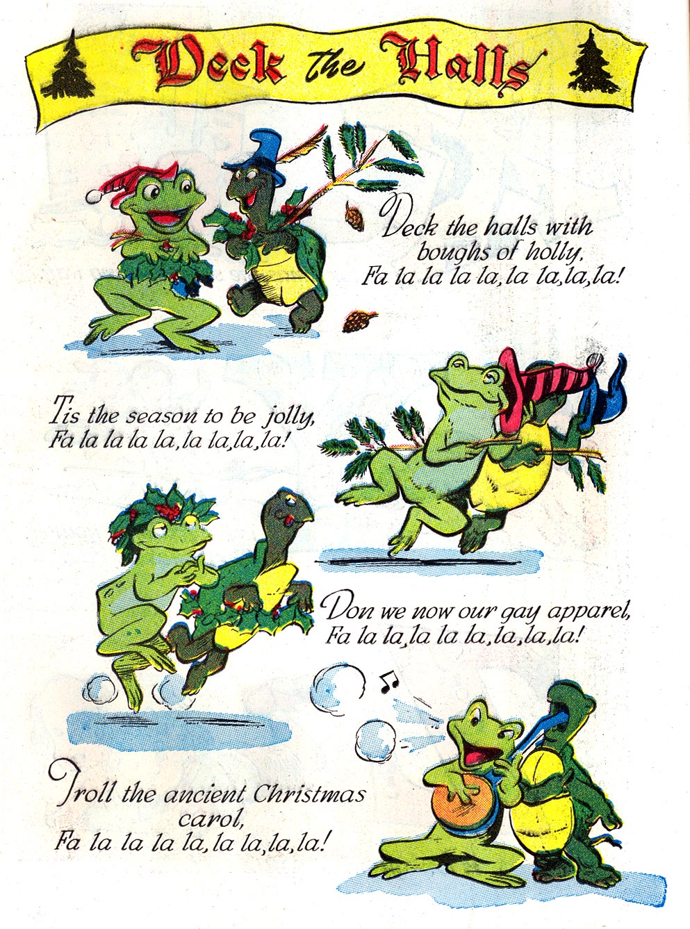 From Four Color: Christmas with Mother Goose #201 (1948), here’s “Deck the Halls,” with cartoon illustrations by Walt Kelly; it’s no “Deck Us All with Boston Charlie,” but Kelly is clearly having fun with it: