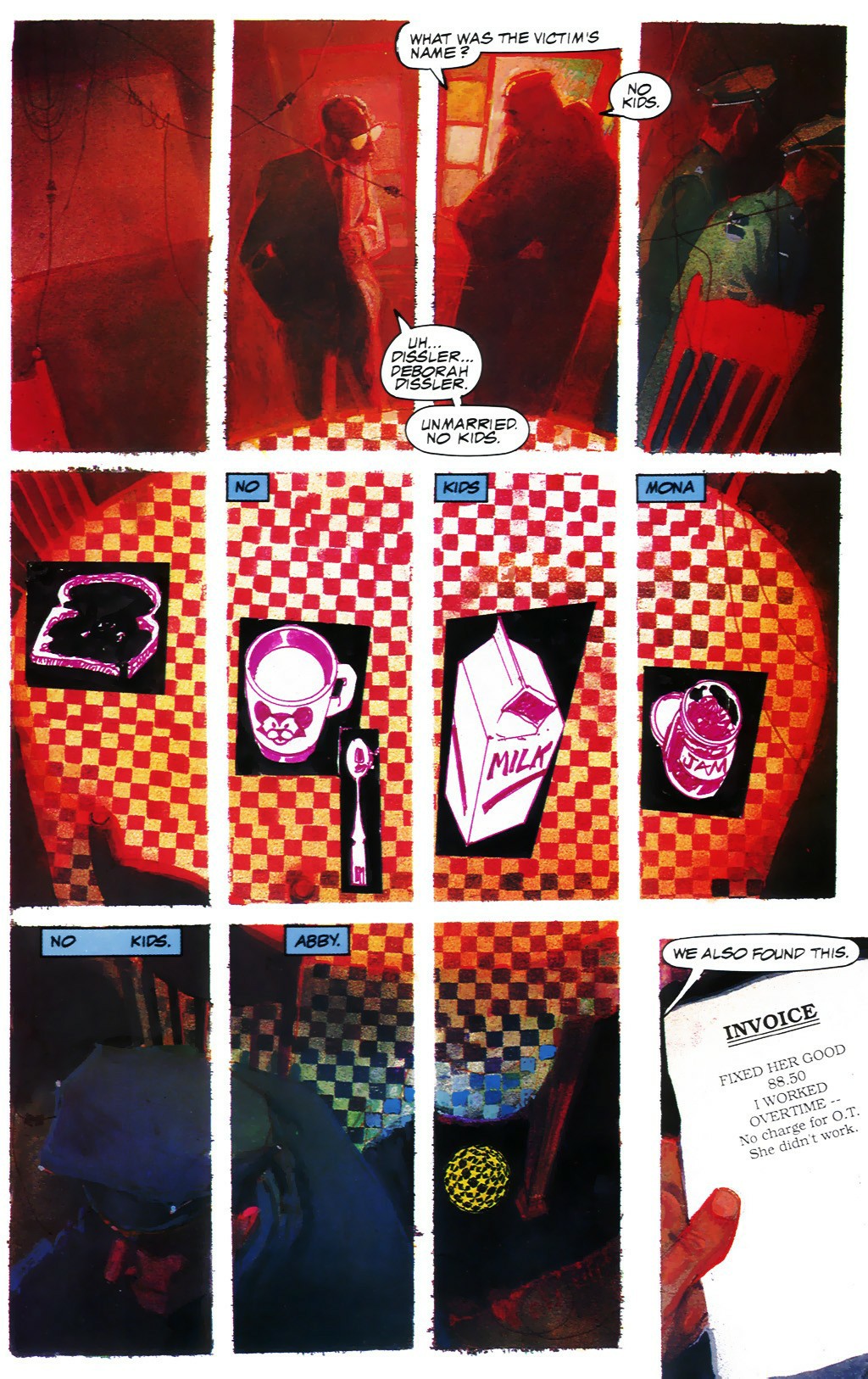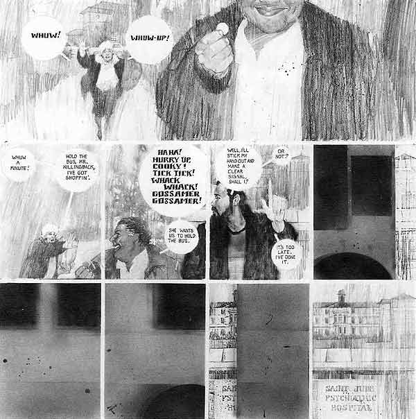 Seven years later, Sienkiewicz was hard at work on the artwork for Big Numbers, where he combined a loose mixed-media illustrative technique with extensive photo reference. Here’s a random sample from issue #1, as featured on Bill Sienkiewicz’s official Web site (where the style is explicitly identified as “photo-realistic”):