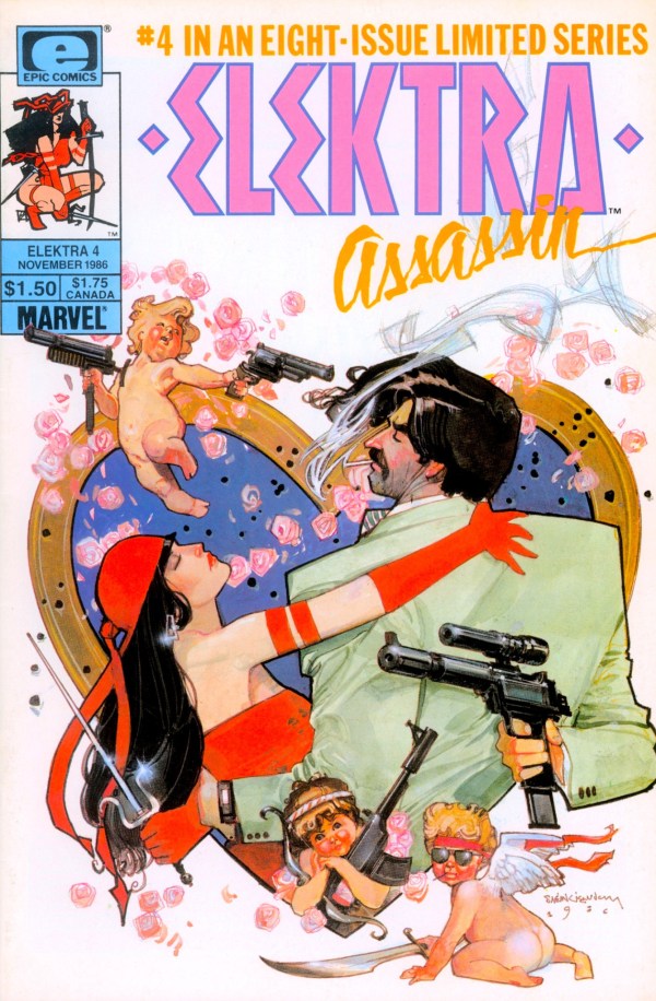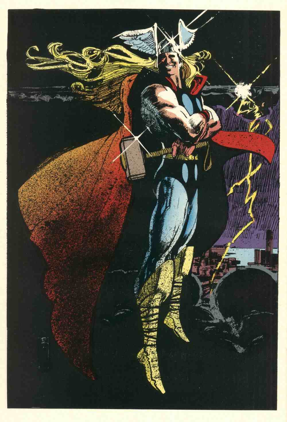 Notice Sienkiewicz’s Jeffrey Jones-inspired signature. Not really any evidence of Jones’s influence in the drawing, however. Ralph Steadman, maybe. Bob Peak, definitely — especially in the Thor image, but in some of the others as well. Neal Adams, definitely — all over the place. Jones, not so much.
