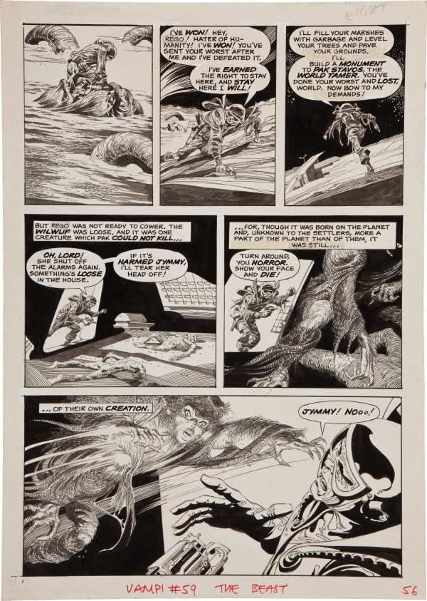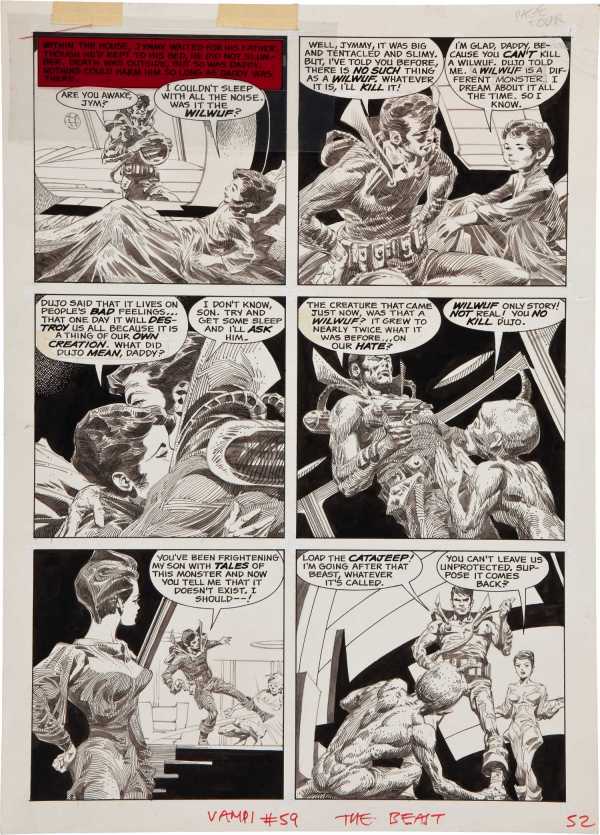 In tribute to the master, I’ve assembled a small gallery of scans, displayed below, that includes several comic covers from the 1950s, pencilled by Infantino and finished by various inkers, including Sy Barry and Bob Lander, along with one cover from 1964, inked by Murphy Anderson, and a couple of pages of original art from Vampirella #59, inked by Alex Nino: