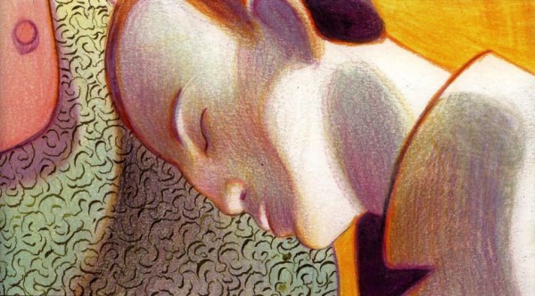 Notice how the greenish colour on the lighted side of the forms in Davis’s illustration is pretty much the same value as the orange background. It’s that similarity of value, combined with a lack of any truly dark darks, that I think makes the details of the illustration so difficult to discern. Sure, the narrow range of values in the illustration makes the busy letter forms of the superimposed title more readable than they otherwise would be. Just look what happens, for instance, when I bump up the contrast on that greyscale image: