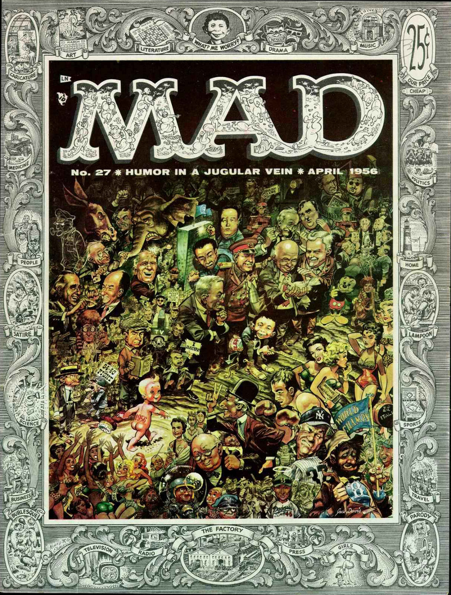 Here’s a really busy cover in which expert designer and all-round comics genius Harvey Kurtzman uses visual hierarchy and contrast to enable the viewer to take in the various elements, all of which are easily readable, in an orderly fashion, without any confusion as to what is most important, what is next most important, and so on, and so forth: