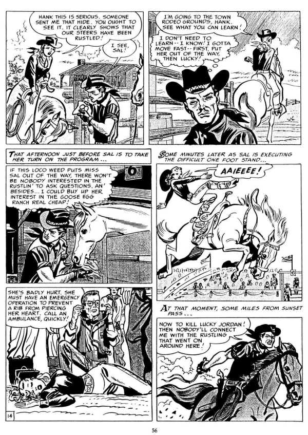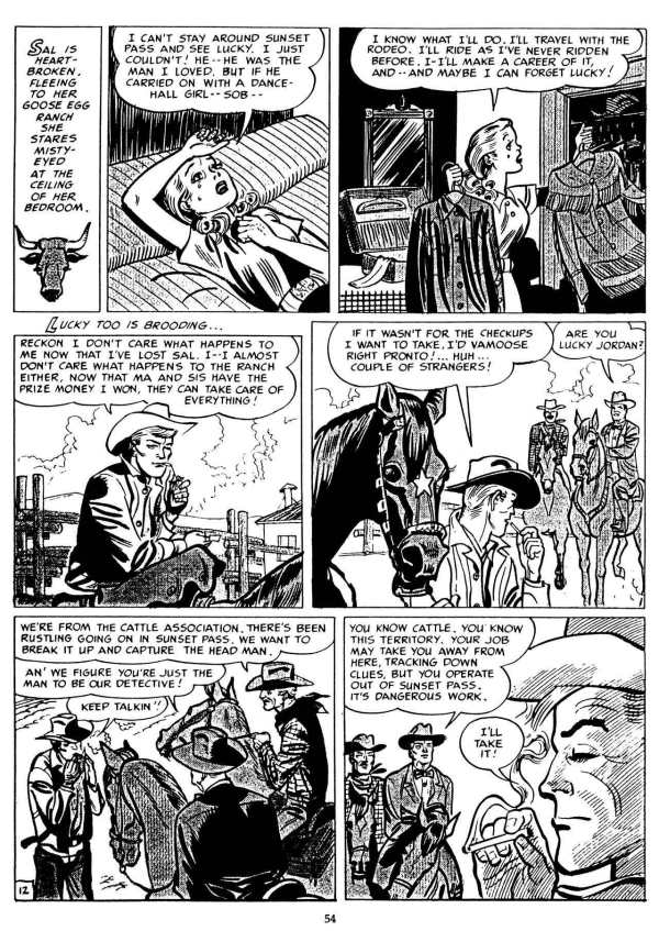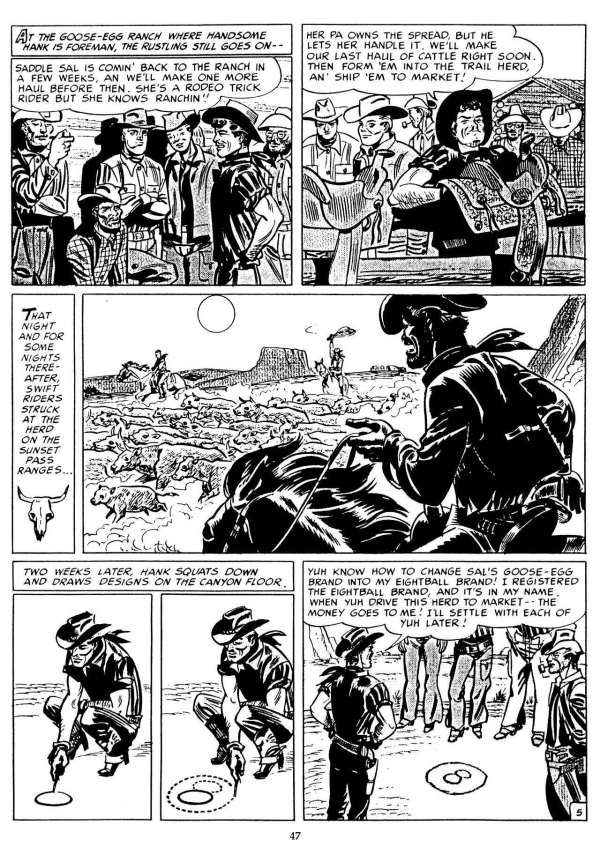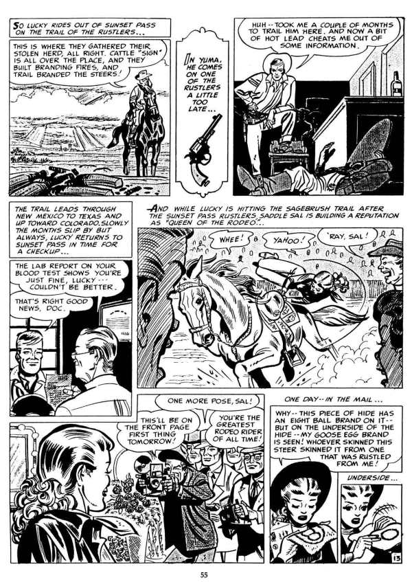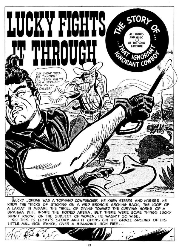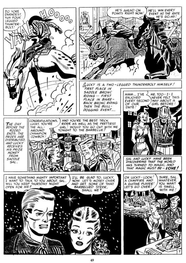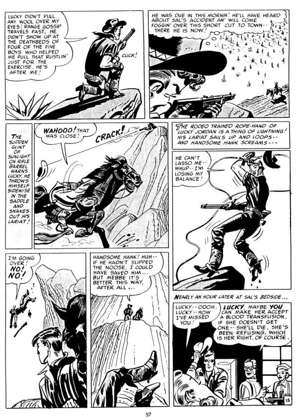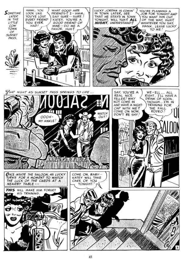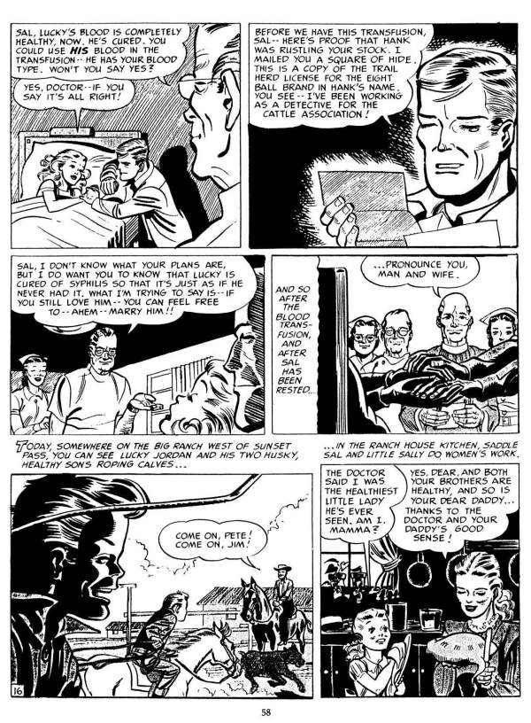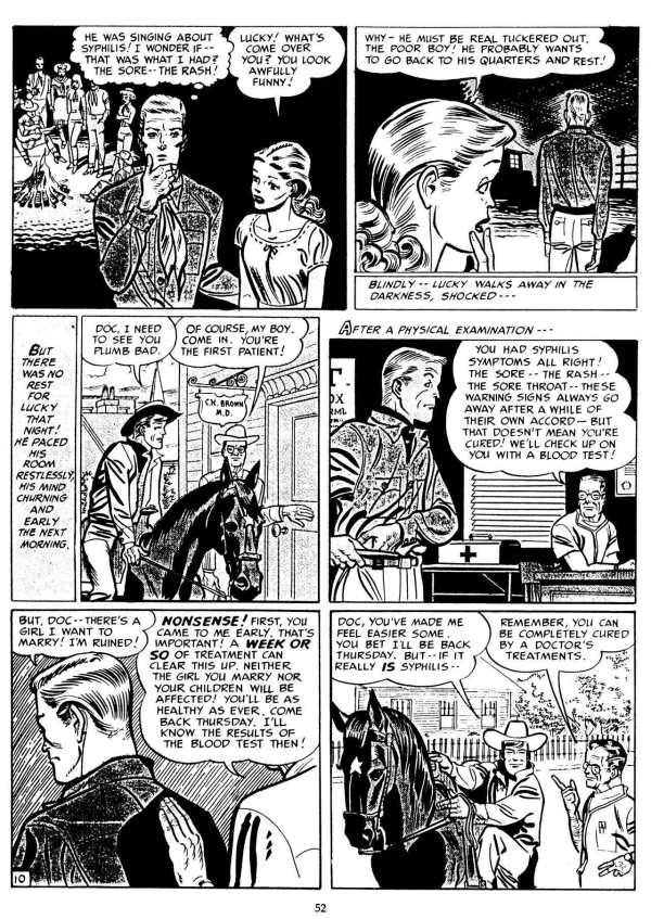 It’s a little known bit of historical comics trivia that Harvey Kurtzman’s first work for EC appeared in a commercial giveaway comic intended to educate readers on the symptoms and treatment of syphilis. Set in the old West, Lucky Fights It Through reveals a talented young artist — Kurtzman was about 25 at the time — who was already in full command of the bold, energetic, appealing style that would carry him through the rest of his career in comics — although the influence of Milton Caniff, so obvious here, would quickly fade — and it is entirely due to Kurtzman’s artistry and irreverence that, unlike most “educational comics,” Lucky has remained a compelling read for anyone who appreciates great performances in comics no matter what the venue or occasion; so compelling, in fact, that the story was not only reprinted, in its entirety, in colour in the EC fanzine Squa Tront #7 in 1977, but also appeared in glorious black and white in the 112-page “trade paperback” comics reprint collection Teen-Aged Dope Slaves and Reform School Girls in 1989, some forty years after its original publication in 1949. If you’re curious to read the comic for yourself, the blog Hairy Green Eyeball II has had the colour reprint available for your viewing/reading pleasure since 25 August 2008, and as of today, RCN has the black-and-white reprint, posted below. Enjoy!