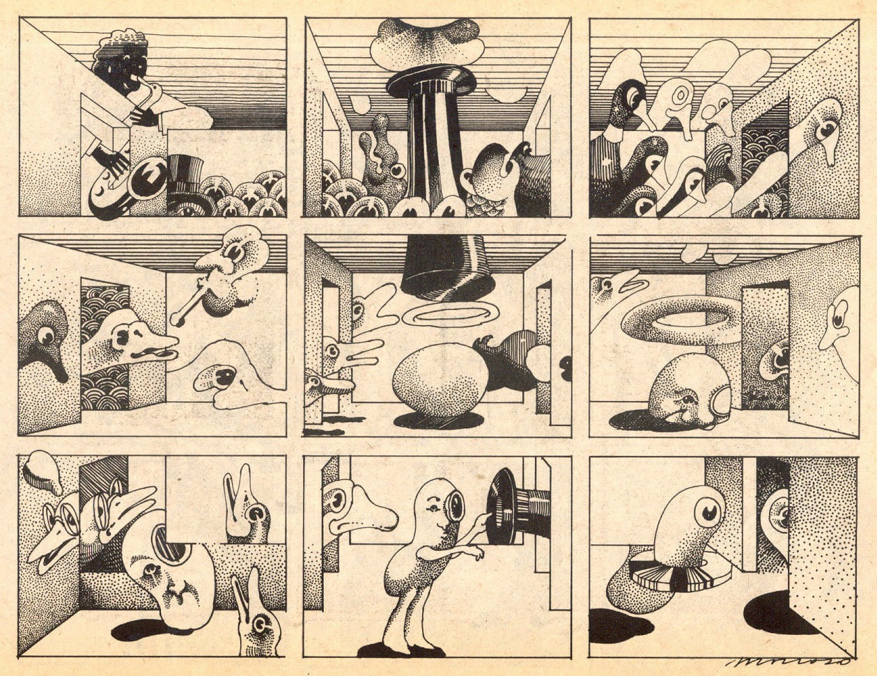 Underground comics, or comix, were typically printed in black and white on cheap pulp paper and stapled together with a colour cover printed on glossier stock. While many underground artists/publishers over the years have reserved the back cover as a showcase for full-page illustrations in colour, others have viewed it as an opportunity to give one carefully selected comics page a more lavish treatment! Here are thirteen “back cover comix” — twelve sequential; one non-sequential — from various underground comics with publication dates ranging from 1970 to 1993; information for each piece is embedded in the file title. Listed in the order their work is displayed below, the artists are Victor Moscoso, Foolbert Sturgeon, Fred Schrier, Skip Williamson, Lee Marrs (with Gail Madonea), Victor Moscoso (x2), B. Kliban, Harvey Kurtzman, Pokkettz, Gilbert Shelton, R. Diggs, and Stephane Blanquet: