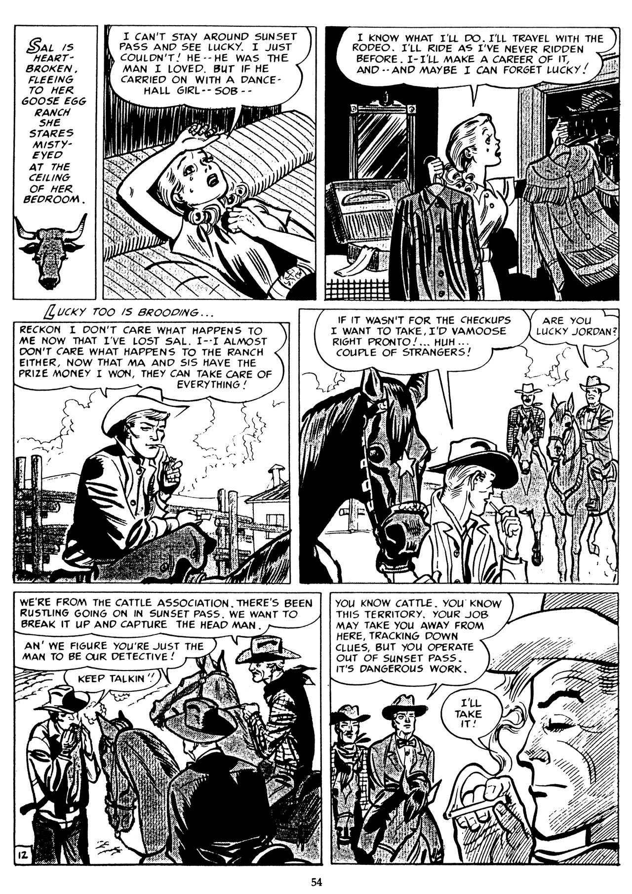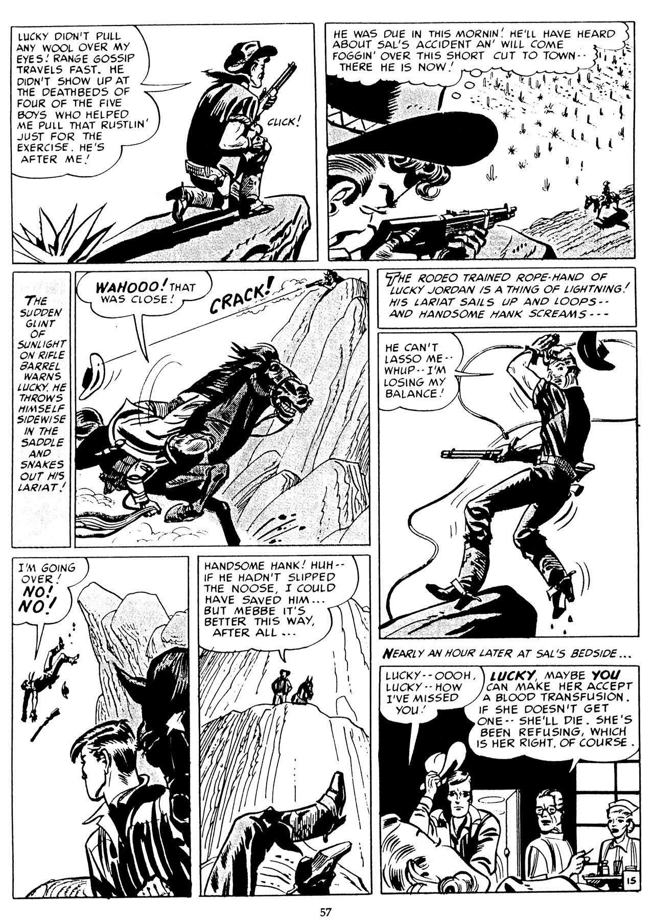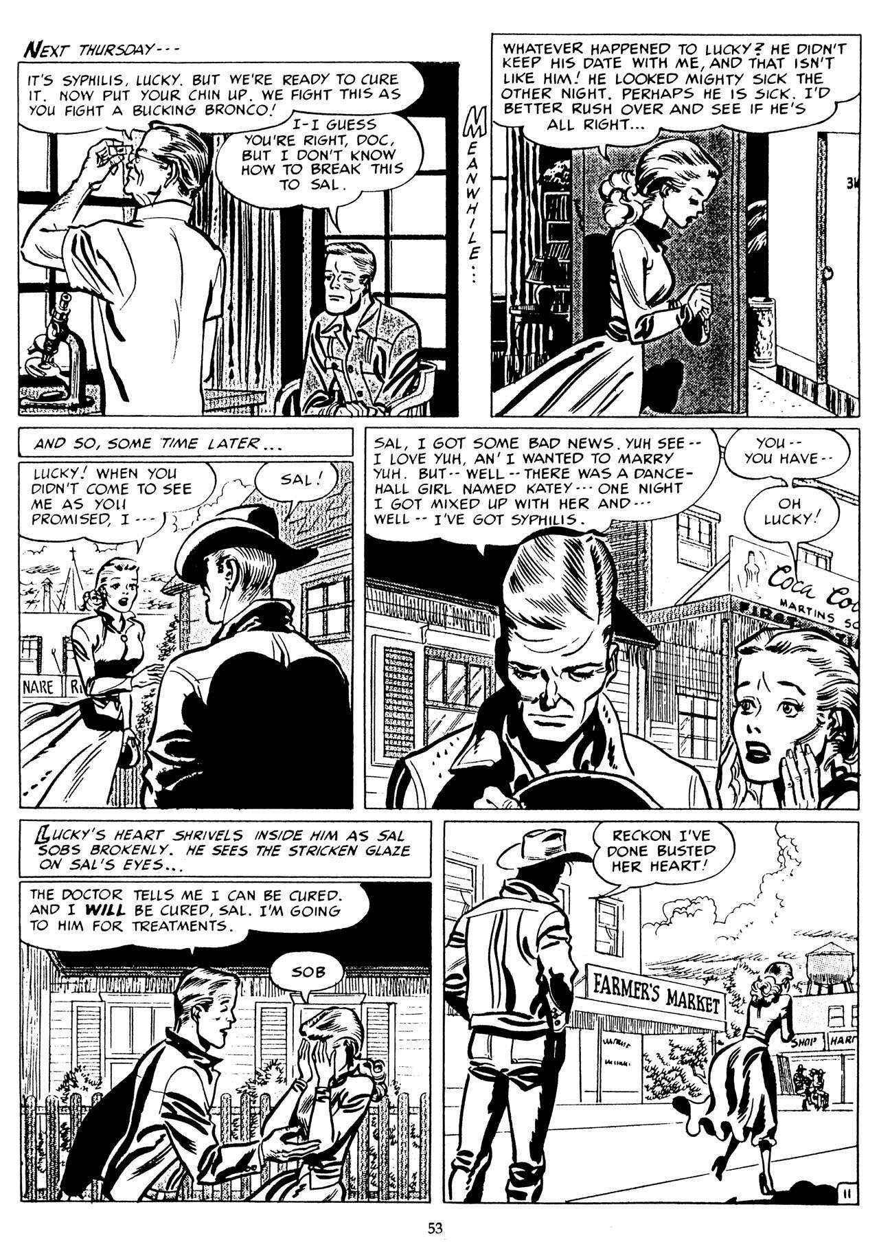 It’s a little known bit of historical comics trivia that Harvey Kurtzman’s first work for EC appeared in a commercial giveaway comic intended to educate readers on the symptoms and treatment of syphilis. Set in the old West, Lucky Fights It Through reveals a talented young artist — Kurtzman was about 25 at the time — who was already in full command of the bold, energetic, appealing style that would carry him through the rest of his career in comics — although the influence of Milton Caniff, so obvious here, would quickly fade — and it is entirely due to Kurtzman’s artistry and irreverence that, unlike most “educational comics,” Lucky has remained a compelling read for anyone who appreciates great performances in comics no matter what the venue or occasion; so compelling, in fact, that the story was not only reprinted, in its entirety, in colour in the EC fanzine Squa Tront #7 in 1977, but also appeared in glorious black and white in the 112-page “trade paperback” comics reprint collection Teen-Aged Dope Slaves and Reform School Girls in 1989, some forty years after its original publication in 1949. If you’re curious to read the comic for yourself, the blog Hairy Green Eyeball II has had the colour reprint available for your viewing/reading pleasure since 25 August 2008, and as of today, RCN has the black-and-white reprint, posted below. Enjoy!