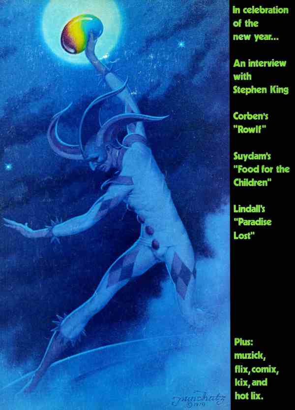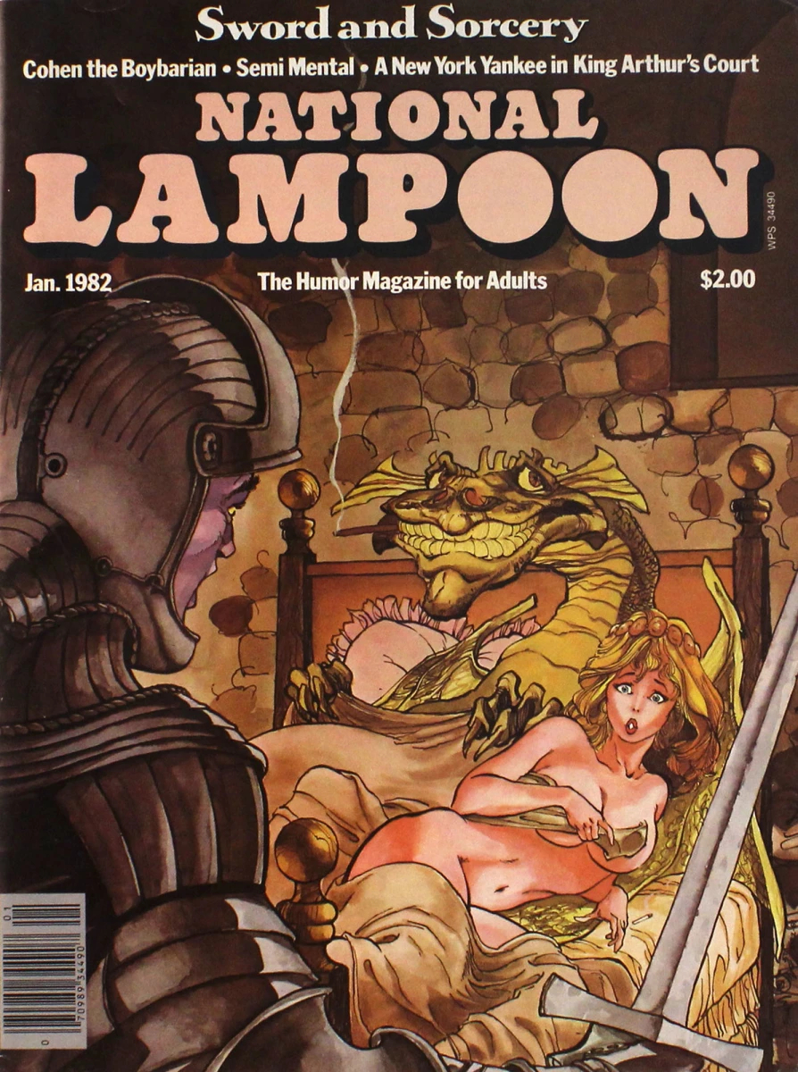 The love triangle between the knight, the damsel, and the dragon depicted in both the Jones painting and the Simonson cover is oddly, unintentionally, wryly symbolic. As many comics fans know, Walt Simonson’s wife, Louise, had previously been married to Jeffrey Jones. Jeffrey and Louise had met at college in 1964, married in 1966, and eventually divorced some time in the early 1970s, or so it has been vaguely reported. Meanwhile, Louise Jones apparently met Walt Simonson in 1973, they began dating in 1974, and they married in 1980. Thus, in a sense, Jones was the knight who lost the damsel to the dragon, and what’s more — adding insult to injury, so to speak — failed to win the competition, if one may refer to it as such, with Simonson to have work published on the cover of National Lampoon. Or maybe Jones suggested Simonson for the job when his (Jones’s) painting was rejected. That’s a nice thought, though I have zero evidence to back it up…