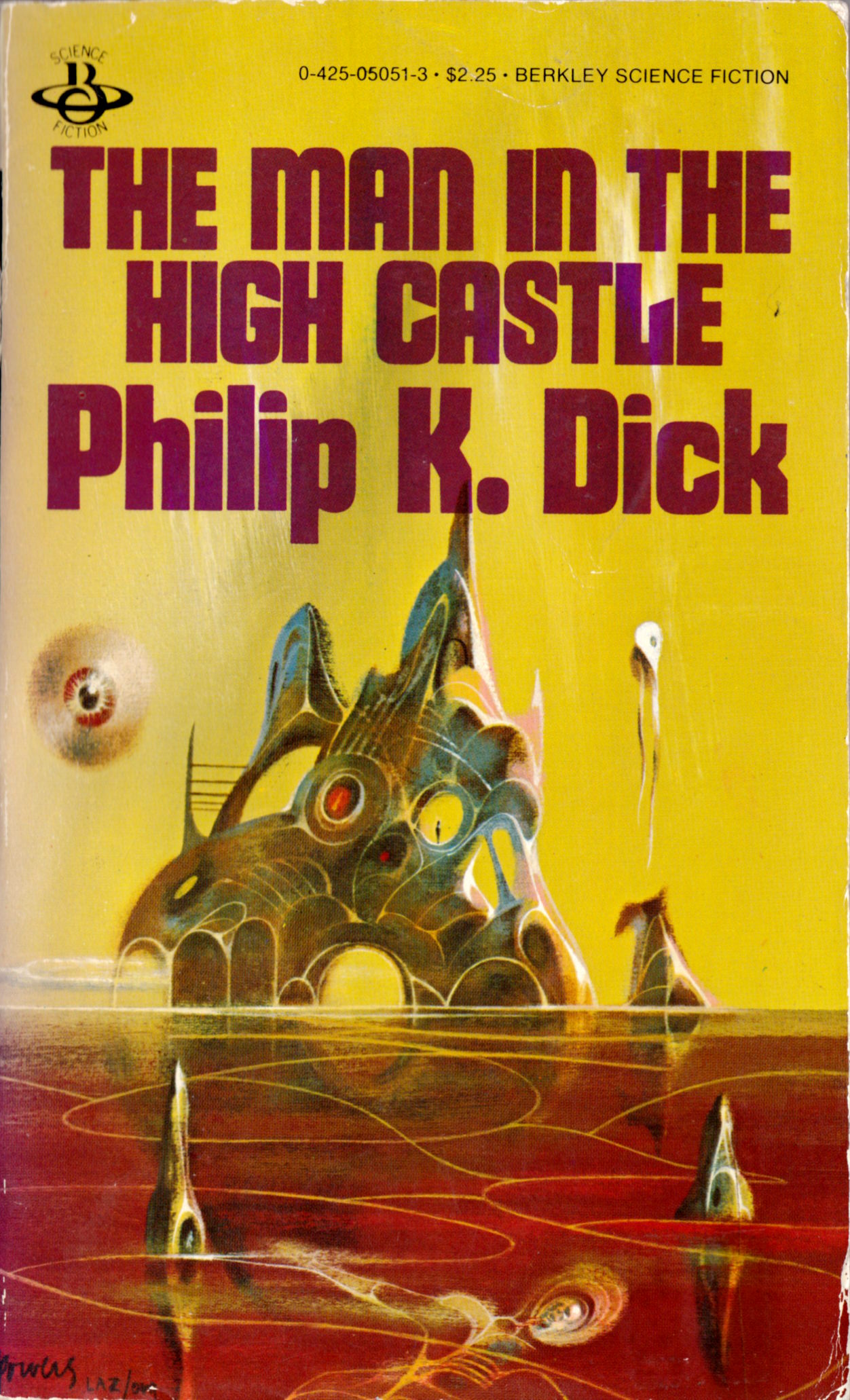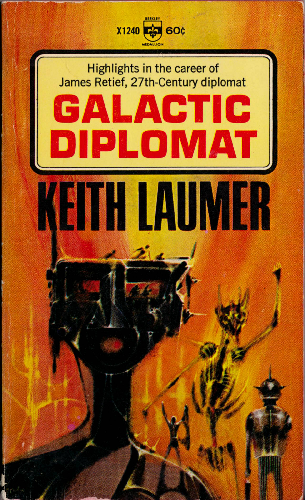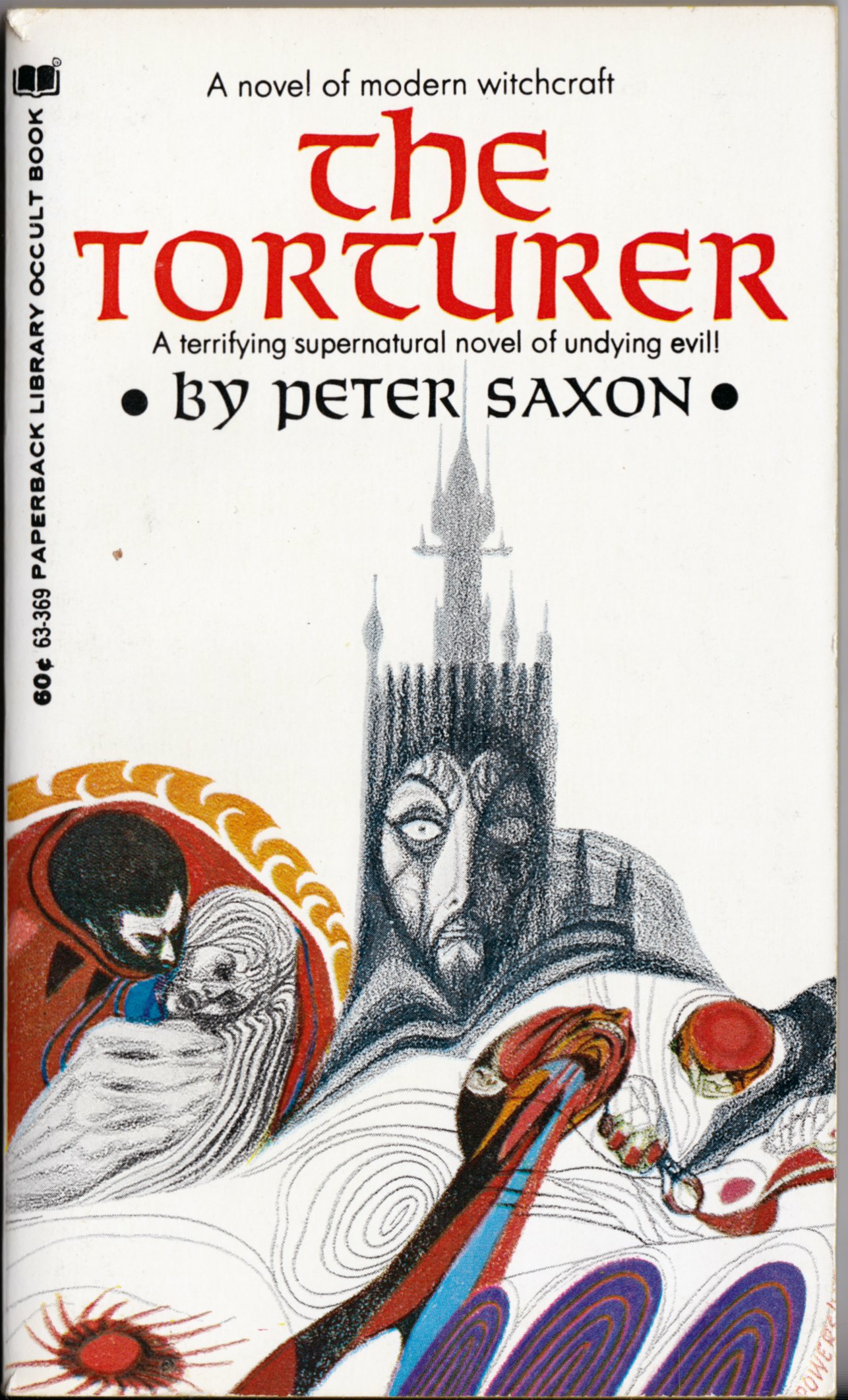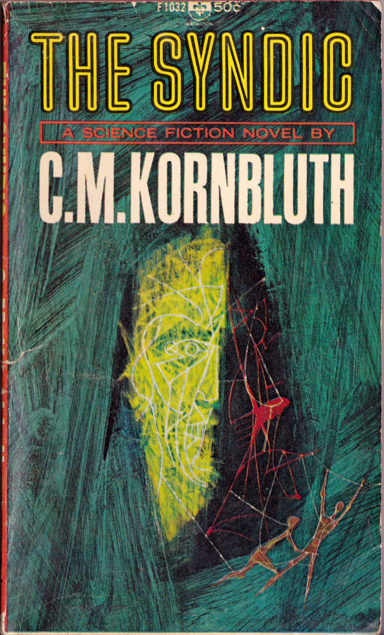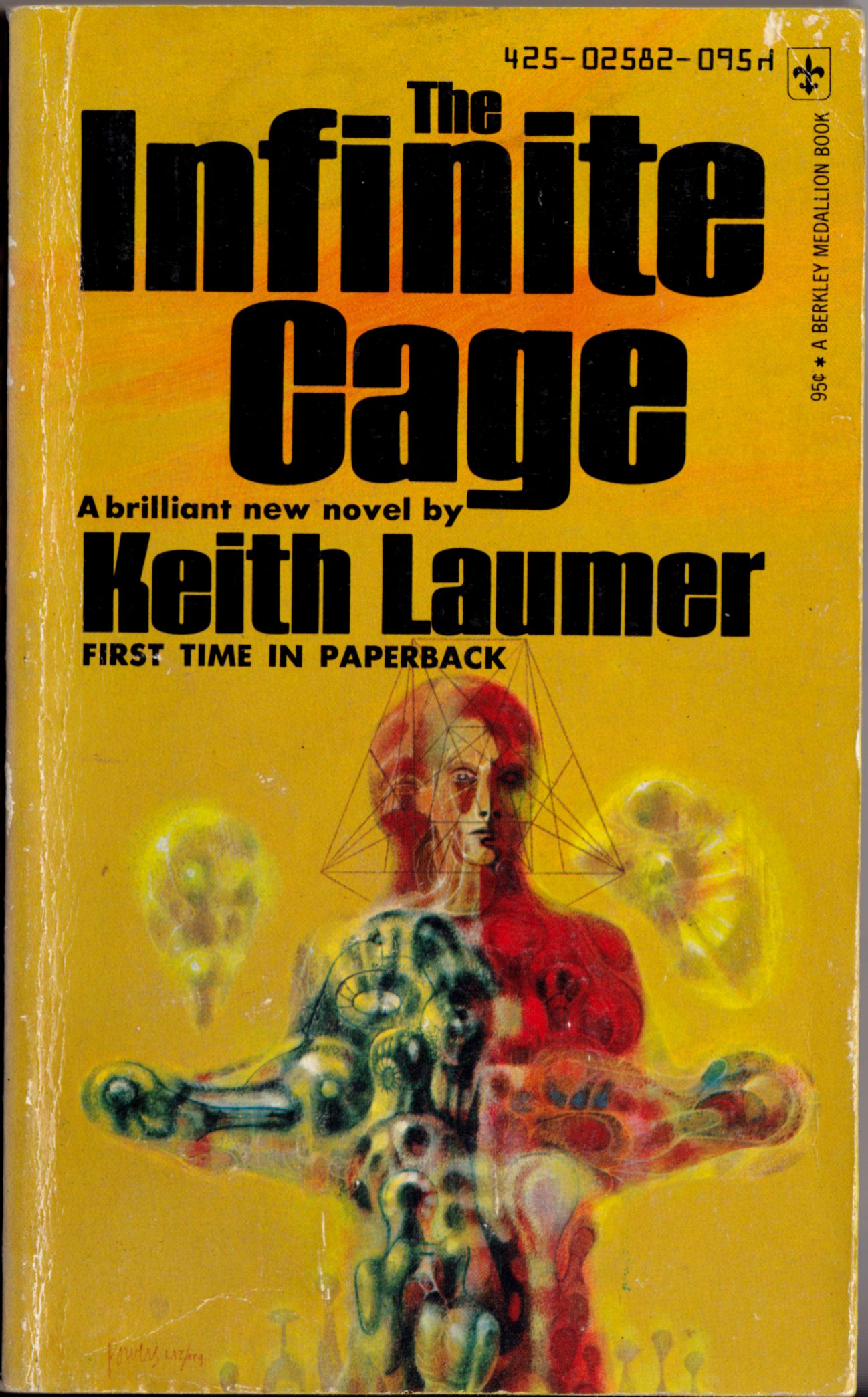 Powers didn’t produce many covers with collage elements that are as obvious as the mechanical building blocks of his art for Lester del Rey’s Mortals and Monsters, but he makes it work, splendidly, as usual. The dotted line and black dot on the left-hand side give the collage a sardonic twist: all that complex machinery, and the result is what? a pop gun?
