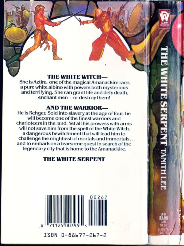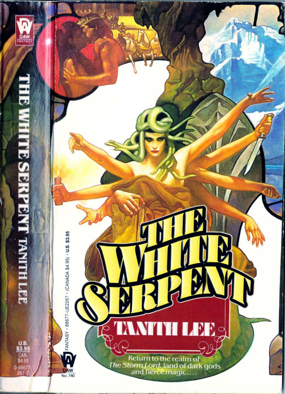 For the purposes of comparison, I have just added a sample of a toothless Sanjulian cover from 1988 to this post, and I have to say, I really and truly find it hard to believe that The White Serpent is by the same artist as Worms of the Earth. The decorative, Alphonse-Mucha-meets-stained-glass Art Nouveau style of The White Serpent, with its snaking jumbles of imagery interrupted by snaking black pseudo “lead lines,” will be familiar to the readers of a certain strain of brick-like romance novels, and no doubt covers in that style sell a lot of books (or why would publishers inflict them on book buyers!?), but man, everything about The White Serpent, from its rainbow colour palette to its unctuous paint surface, is so gooey, so cloying, so like pure corn syrup, straight from the jar, jazzed up with food colouring… unlike Mucha’s original confections, which were so perfectly formed, so sweetly balanced, so like the best kind of candy! Or maybe I’m just cranky this morning…